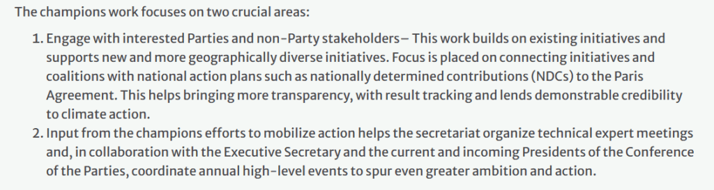 De prijs voor de meest evidente bullshitfunctie gaat naar de Climate High-Level Champions (CHLC’s). Op elke COP wordt er één benoemd, en het is volstrekt duister wat deze functionaris geacht wordt te doen. Althans, misschien mis ik iets in onderstaande taakomschrijving die me onweerstaanbaar aan het werk van Wim T. Schippers doet denken: