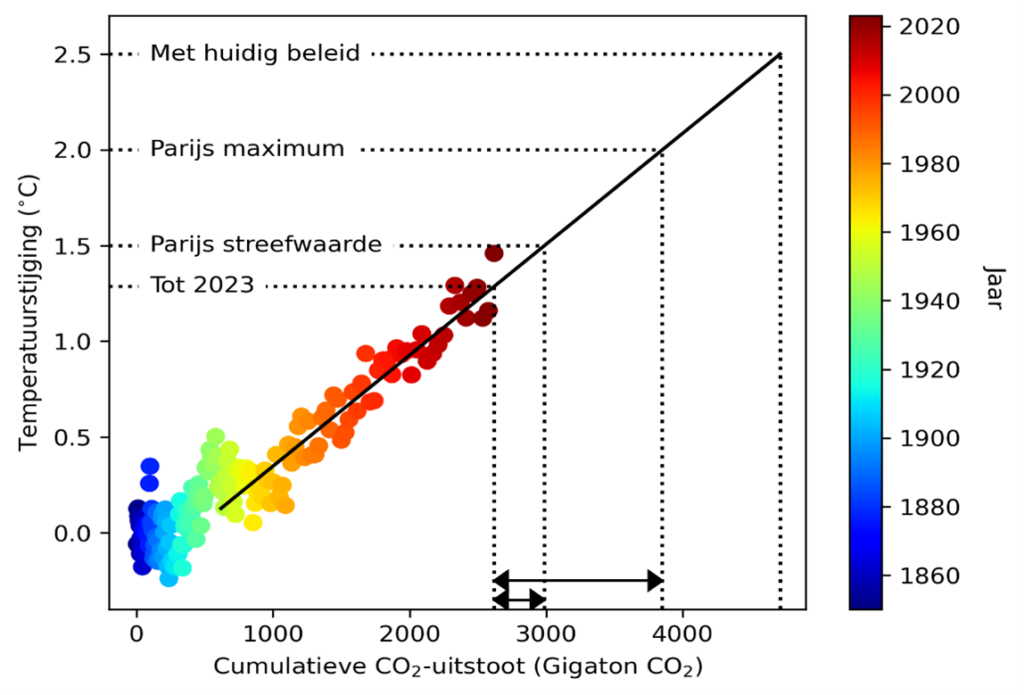 Op de verticale as staat de opwarming ten opzichte van de pre-industriële periode in graden Celsius en op de horizontale as de cumulatieve CO2-uitstoot sinds het begin van de industriële periode uitgedrukt in de massaeenheid Gigaton. De gekleurde balletjes zijn de jaarlijkse ‘meetpunten’ en geven de geregistreerde opwarming weer in een bepaald jaar en de daarbij behorende cumulatieve uitstoot. De rechte lijn is een ’best linear fit’ door de meetpunten. Het is meer dan verbazingwekkend dat het uiterst complexe proces van opwarming van de aarde door de uitstoot van CO2 en andere broeikasgassen zich uiteindelijk laat vatten in een simpele rechte lijn. Hoera voor de klimaatwetenschap die deze rechte lijn aan het licht heeft gebracht.