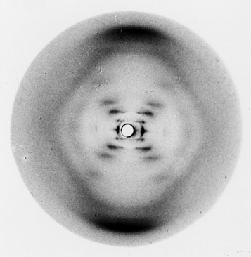 Het zij u vergeven als u in bovenstaande foto niet meteen een dubbele helix herkent: ook Watson en Crick konden dat niet zomaar. Zo’n röntgenfoto is namelijk in de verste verte geen plaatje van een DNA-molecuul. Het is een soort QR-code die je alleen globale symmetrie-eigenschappen van een molecuul vertelt.